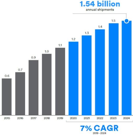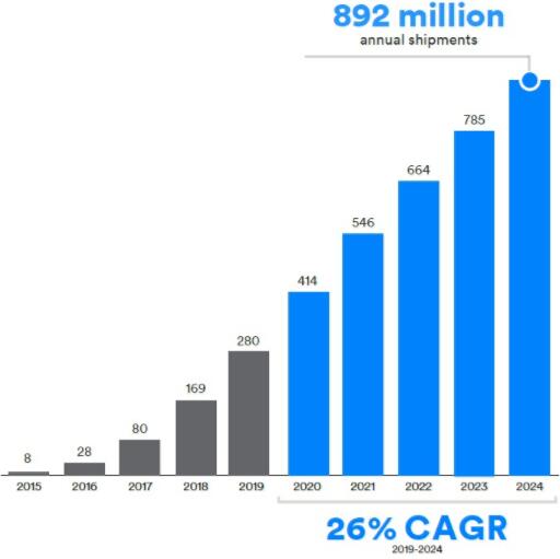 ● 音頻流應(yīng)用包括:語音通話、收聽音頻/音樂、視聽設(shè)備、智能語音控制。2019-2024年增長率為7%,到2024年出貨量將達15.4億個。