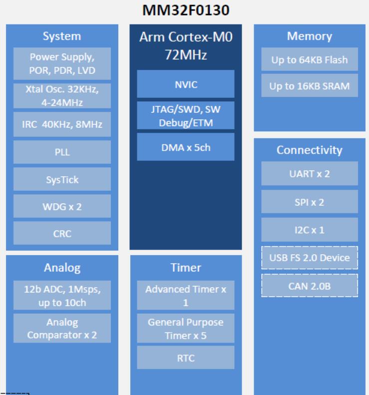 上海靈動微電子通用MCU MM32F0130擁有M0內核的高性能的32位微控制器,工作頻率可達72兆赫茲,并內置高速flash存儲器,具有增強型I/O端口和外設連接到外部總線。其工作電壓為2.0V~5.5V,常規(guī)型環(huán)境工作溫度范圍-40?C∼85?C和擴展型溫度范圍-40?C∼105?C。且多種省電工作模式保證低功耗應用的要求。