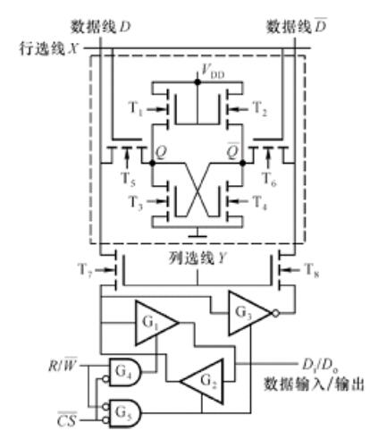 其中存儲單元通過T5、T6和數(shù)據(jù)線(位線)相連;數(shù)據(jù)線又通過T7、T8和再經(jīng)輸入/輸出緩沖電路和輸入/輸出線相連接,以實現(xiàn)信息的傳遞和交換。寫入信息的操作過程,在第一次寫入信息之前,存儲單元中的信息是隨機信息。