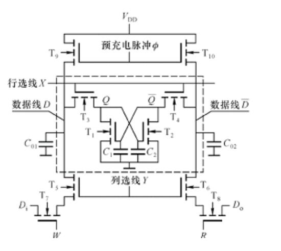 補充充電的過程:加預(yù)充電脈沖∅、預(yù)充電管T9、T10導(dǎo)電,CO1,C02很快充電至VDD,∅撤銷后,CO1,CO2上的電荷保持。然而進行讀出操作:地址有效,行、列選線X、Y高電平;R=1,W=0進行讀出操作,如果原信息為Q=“1”,說明MOS電容C2有電荷,C1沒有電荷(即T2導(dǎo)電,T1截止);這時CO1上的電荷將對C2補充充電,而CO2上的電荷經(jīng)T2導(dǎo)電管放掉,結(jié)果對C2實現(xiàn)了補充充電。讀出的數(shù)據(jù)仍為,