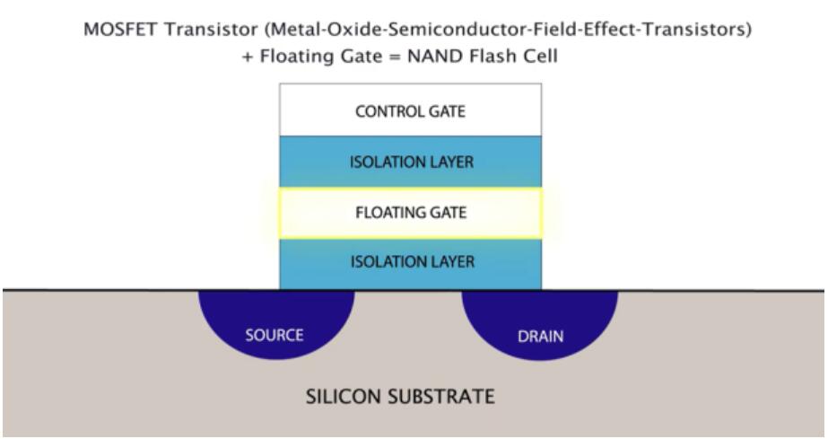 閃存單元由修改的場效應(yīng)晶體管(FET)組成,在控制柵極和通道之間的絕緣層中具有額外的“浮置”柵極。通過施加高壓將電荷注入到浮柵上(或從浮柵上去除)。這會改變打開晶體管所需的柵極電壓,該電壓代表存儲在單元中的值。這些單元的陣列構(gòu)成一個(gè)塊,整個(gè)存儲器由多個(gè)塊組成。