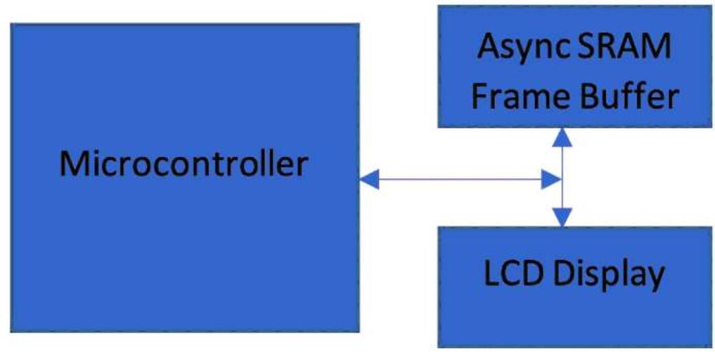 SRAM將無(wú)法提供足夠的容量或性能。為了避免畫面撕裂,也有必要采用雙緩存。在這些系統(tǒng)中通常在外部存儲(chǔ)器中實(shí)現(xiàn)幀緩存。在刷新周期中,從外部幀緩存讀取數(shù)據(jù),并連同控制信號(hào)輸出給顯示控制器數(shù)據(jù)總線。圖1所示的是采用外部幀緩存的典型顯示框圖。
