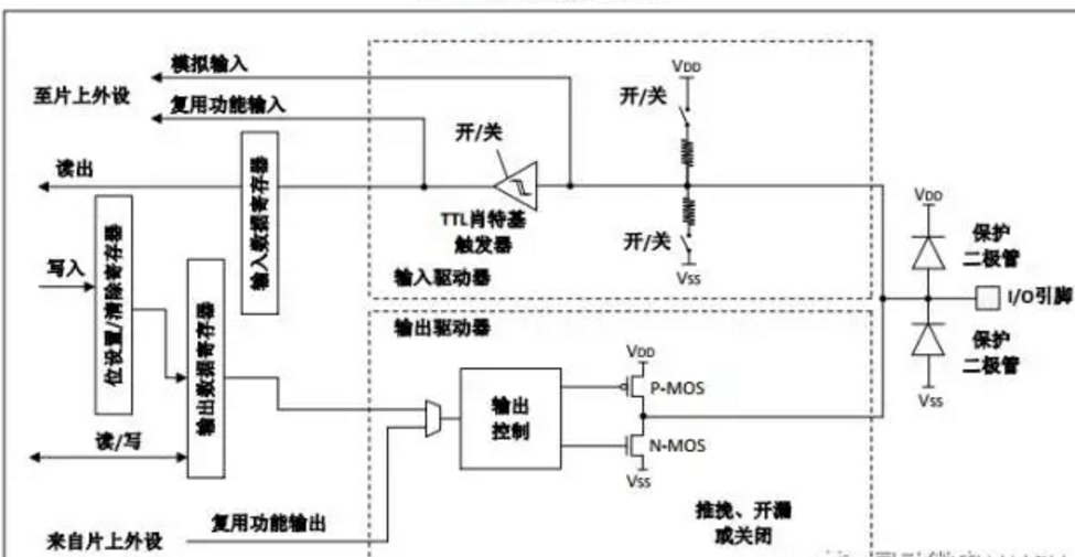模擬輸入是指模擬信號的輸入。配置模擬輸入時,所有的上拉、下拉電阻和施密特觸發(fā)器,均處于禁止?fàn)顟B(tài),因此“輸入數(shù)據(jù)寄存器”將不能反映端口上的電平狀態(tài),也就是說模擬輸入配置下,CPU不能在“輸入數(shù)據(jù)寄存器”上讀到有效的數(shù)據(jù)。