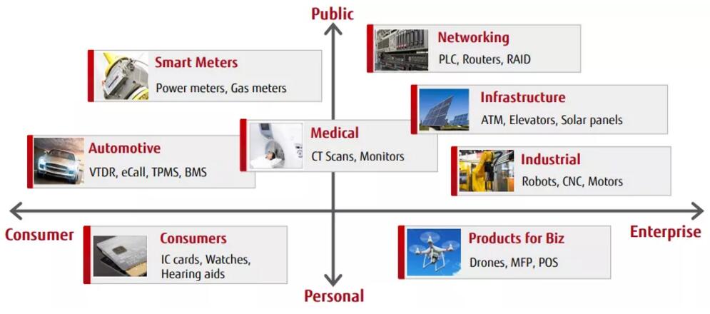 經(jīng)過(guò)市場(chǎng)的長(zhǎng)期廣泛驗(yàn)證以及技術(shù)的不斷突破,富士通FRAM產(chǎn)品已成功應(yīng)用于智能卡及IC卡等卡片領(lǐng)域、電力儀表及產(chǎn)業(yè)設(shè)備等工業(yè)領(lǐng)域,醫(yī)療設(shè)備及醫(yī)療RFID標(biāo)簽等醫(yī)療領(lǐng)域、胎壓監(jiān)測(cè)及新能源汽車(chē)電池管理系統(tǒng)等汽車(chē)領(lǐng)域等等,涉及的應(yīng)用超過(guò)200種,幾乎覆蓋所有主要領(lǐng)域!