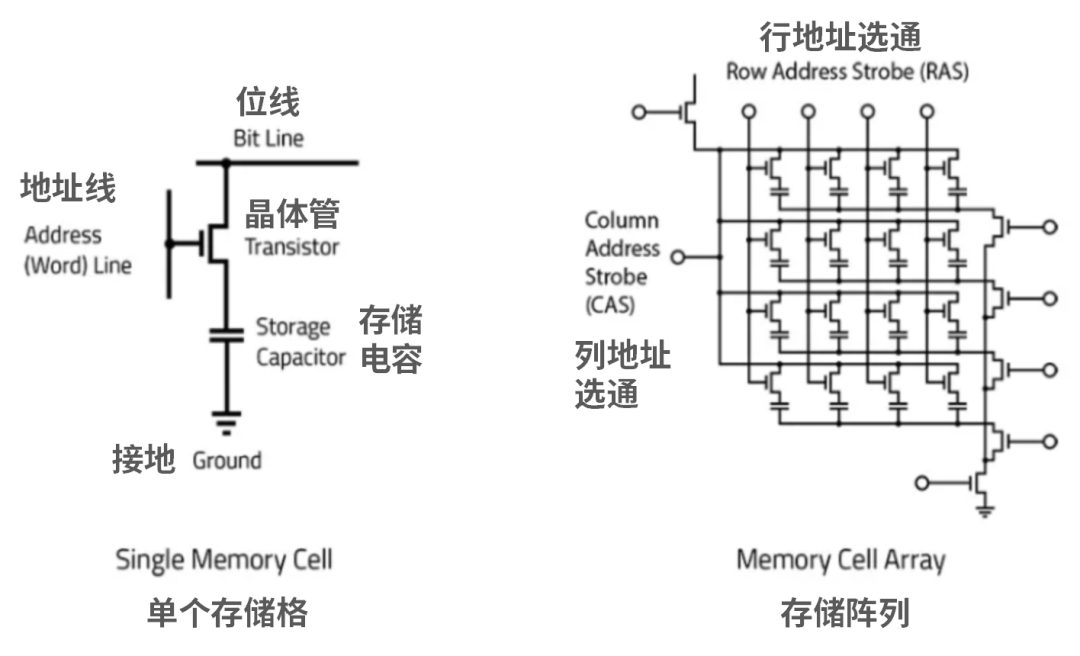 DRAM由許多重復(fù)的位元格組成,每一個(gè)基本單元由一個(gè)電容和一個(gè)晶體管構(gòu)成。電容中存儲(chǔ)電荷量的多寡,用于表示“0”和“1”。而晶體管,則用來控制電容的充放電。