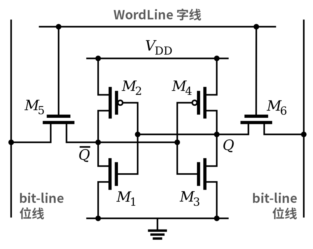 SRAM的基本單元,則最少由6管晶體管組成:4個(gè)場效應(yīng)管(M1,M2,M3,M4)構(gòu)成兩個(gè)交叉耦合的反相器,2個(gè)場效應(yīng)管(M5,M6)用于讀寫的位線(BitLine)的控制開關(guān),通過這些場效應(yīng)管構(gòu)成一個(gè)鎖存器(觸發(fā)器),并在通電時(shí)鎖住二進(jìn)制數(shù)0和1。因此,SRAM被稱為“靜態(tài)隨機(jī)存儲(chǔ)器”。