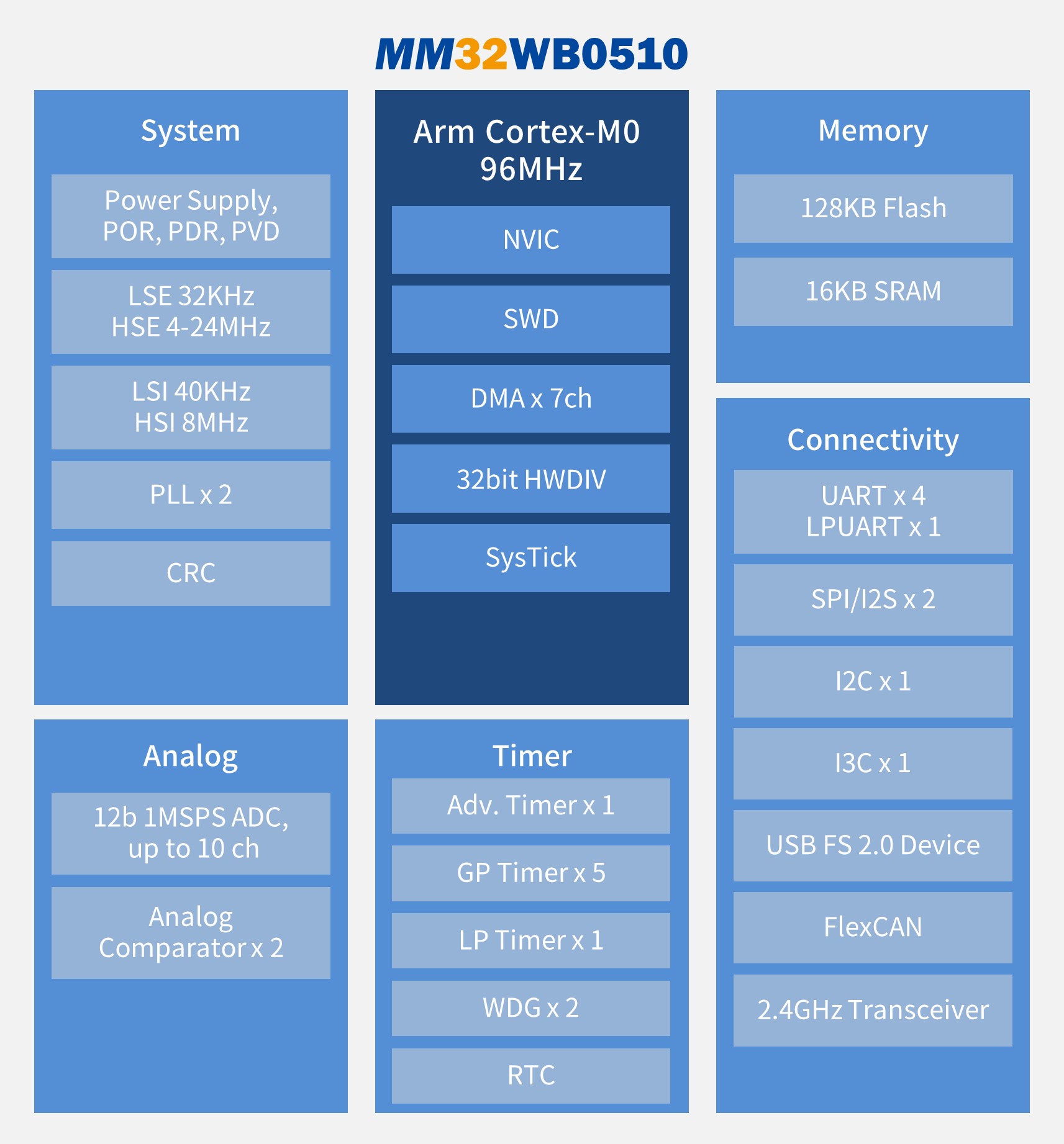 MM32WB0510搭載Arm Cortex-M0內(nèi)核,主頻可達96MHz,內(nèi)置128KB Flash和16KB SRAM,并集成了USB和FlexCAN接口,面向智能家居,鍵鼠,消防現(xiàn)場部件,電力電子,汽車OBU,汽車傳感器等無線和多接口類型的應(yīng)用??蛇x封裝形式包括:LQFP64,LQFP48,QFN48和QFN32。