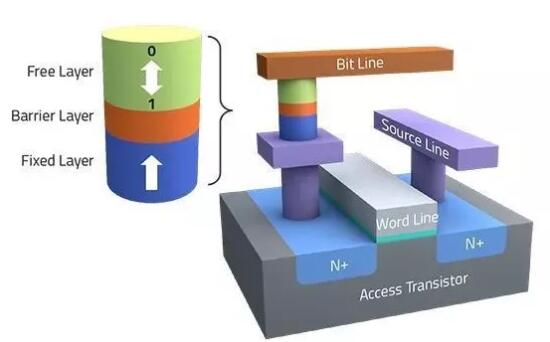 STT-MRAM是具有磁隧道結(jié)(MTJ)存儲器單元的單晶體管架構(gòu)。它利用電子自旋的磁性在芯片中提供非揮發(fā)性特性。寫入和讀取功能在MTJ單元中共享相同的并行路徑。