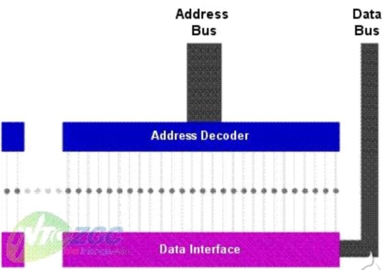 上圖中的小圓點(diǎn)代表RAM中的存儲(chǔ)空間,每一個(gè)都有一個(gè)唯一的地址線同它相連。當(dāng)?shù)刂方獯a器接收到地址總線傳送來的地址數(shù)據(jù)之后,它會(huì)根據(jù)這個(gè)數(shù)據(jù)定位中央處理器想要調(diào)用的數(shù)據(jù)所在的位置,然后數(shù)據(jù)總線就會(huì)把其中的數(shù)據(jù)傳送到中央處理器。