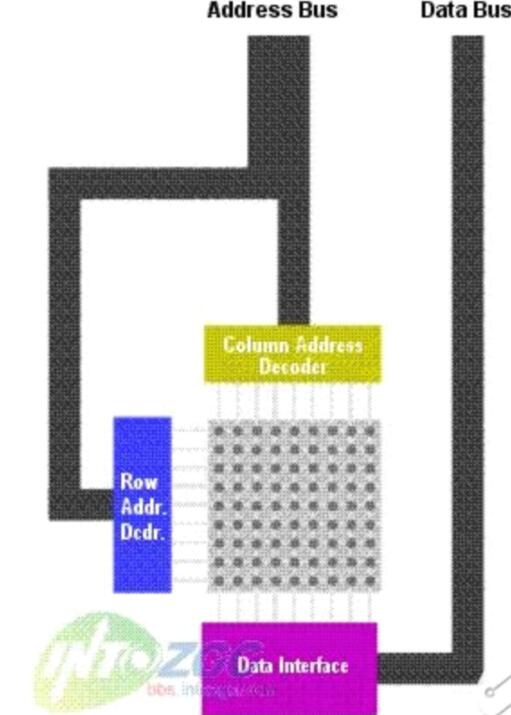 如果RAM對(duì)于CPU來說僅僅是一條“線”的話,還不能體現(xiàn)實(shí)際的運(yùn)行情況。因?yàn)槿绻麑?shí)際情況真的是如此的話,在實(shí)際制造芯片的時(shí)候,會(huì)有很多實(shí)際的困難,特別是在需要設(shè)計(jì)大容量的RAM的時(shí)候。所以一種更好的能夠降低成本的方法是讓存儲(chǔ)信息的“空格”排列為很多行--每個(gè)“空格”對(duì)應(yīng)一個(gè)bit存儲(chǔ)的位置。如果要存儲(chǔ)1024bits(2^10)數(shù)據(jù),那么你只要使用32x32(2^5*2^5=2^10)的矩陣就能夠達(dá)到這個(gè)目的了。很明顯一個(gè)32x32的矩陣比一個(gè)1024bit的行設(shè)備更緊湊,實(shí)現(xiàn)起來也更加容易。請(qǐng)看圖2.