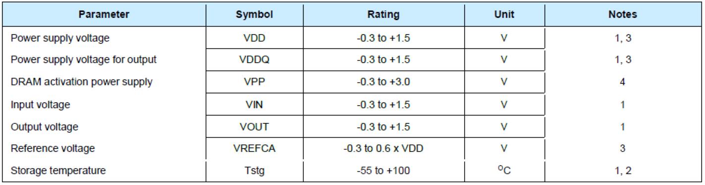 3. VDD和VDDQ始終必須在300mV之內(nèi)。當(dāng)VDD和VDDQ小于500mV時(shí),VREFCA必須不大于0.6×VDDQ;VREFCA可以等于或小于300mV。