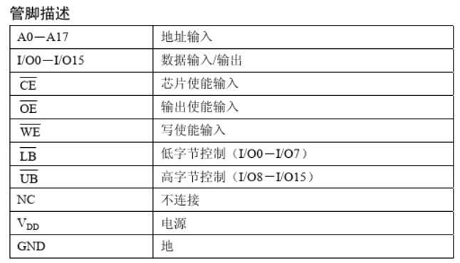 芯片使能輸入CE和輸出使能輸入OE可方便實現(xiàn)存儲器的擴展。低電平有效的寫使能( WE )控制著存儲器的寫和讀操作。高字節(jié)(UB)和低字節(jié)(LB )控制信號控制著對數(shù)據(jù)字節(jié)的訪問。