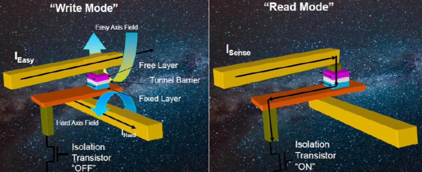 MRAM或磁性隨機(jī)存取存儲器使用具有鐵磁性材料的磁性“狀態(tài)”的1晶體管–1磁性隧道結(jié)(1T-1MTJ)體系結(jié)構(gòu)作為數(shù)據(jù)存儲元素。由于MRAM使用磁性狀態(tài)進(jìn)行存儲(而不是隨時間推移而“泄漏”的電荷),因此MRAM提供了相當(dāng)長的數(shù)據(jù)保留時間(+20年)和無限的耐用性。切換磁極化(寫入周期)是在電磁隧道結(jié)(MTJ)上方和下方的導(dǎo)線中產(chǎn)生脈沖電流的結(jié)果(見圖1)。電流脈沖產(chǎn)生的相關(guān)H場改變了鐵磁材料自由層的極化,這種磁開關(guān)不需要原子或電子的位移,這意味著沒有與MRAM相關(guān)的磨損機(jī)制。自由層相對于固定層的磁矩改變了MTJ的阻抗(見圖2)。阻抗的這種變化表示數(shù)據(jù)的狀態(tài)(“1”或“0”)。通過測量MTJ的阻抗來實現(xiàn)傳感(讀取周期)(圖3)。MRAM器件中的讀取周期是非破壞性的,并且相對較快(35ns)。讀取操作是通過在MTJ兩端施加非常低的電壓來完成的,從而在部件壽命內(nèi)支持無限的操作。