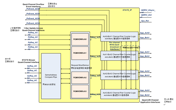 圖2中的STATS_IP架構模塊圖標出了三個子部件:每條通道的同地址比較管道(SACOMP)區(qū)塊、請求-復用-解復用(REQ_MXDMX_CHn)區(qū)塊以及每條QDR IV應用通道1個的4個A-B通道配對計數器邏輯(ABCH_CTRL_CHn)區(qū)塊實例。