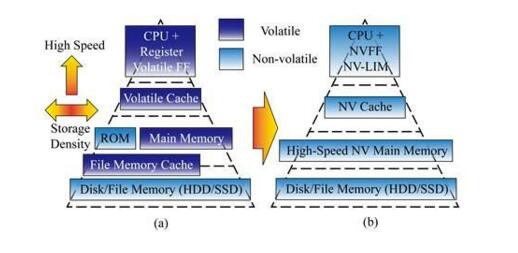 圖1 傳統(tǒng)存儲(chǔ)體系結(jié)構(gòu)(a),新型“萬能存儲(chǔ)器”存儲(chǔ)體系結(jié)構(gòu)(b)